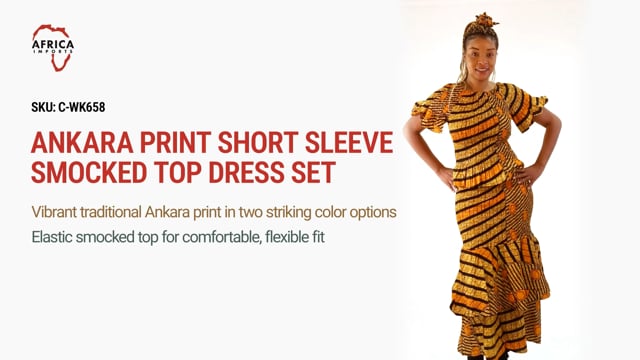 Our Ankara Print Short Sleeve Smocked Top Dress Set combines vibrant African-inspired patterns with comfortable elastic smocking for a flattering silhouette. This traditional two-piece outfit features a fitted top with feminine ruffle sleeves and a matching tiered skirt with dramatic flounces, creating a stylish outfit perfect for celebrations and special occasions.