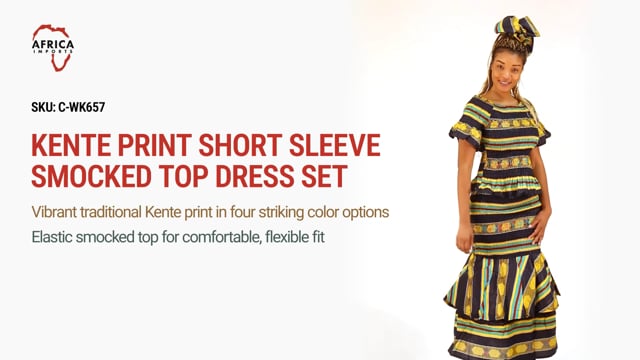 Our Kente Print Short Sleeve Smocked Top Dress Set combines traditional African-inspired patterns with comfortable elastic smocking for a flattering silhouette. This vibrant two-piece outfit features a fitted top with feminine ruffle sleeves and a matching tiered skirt with dramatic flounces, creating a stylish outfit perfect for celebrations and special occasions.